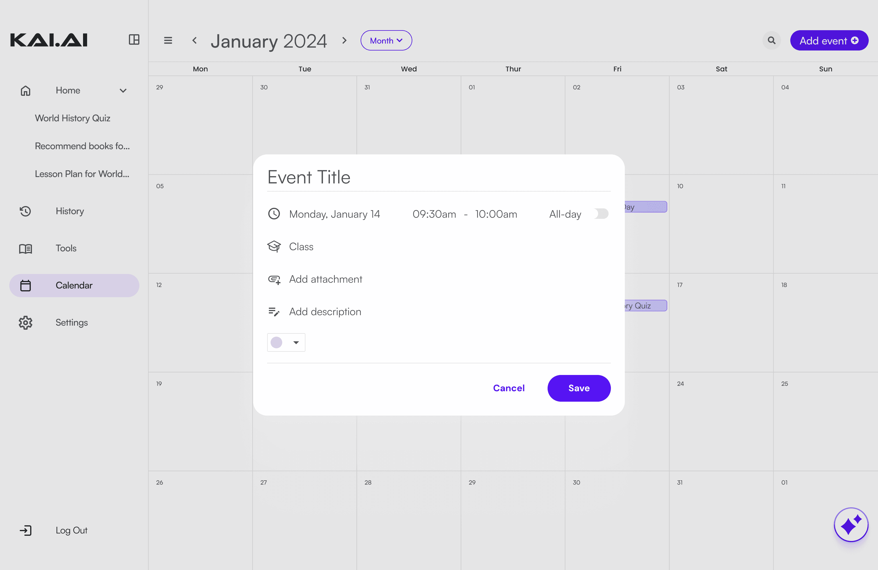 When KAI suggests or creates something, teachers can tap “Add to calendar” directly from the chat bubble. This creates a two-way interaction between the calendar and the AI.